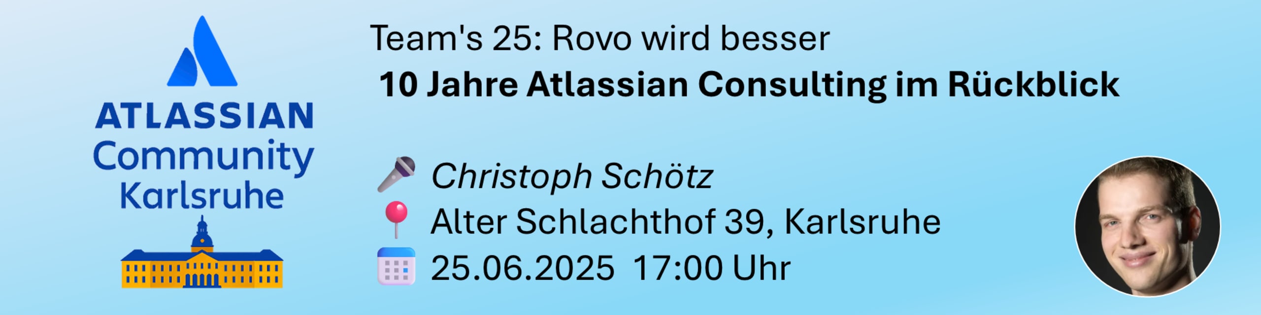 Vortrag: 10 Jahre Atlassian Consulting im Rückblick. Christoph begann seine Atlassian-Beratungslaufbahn 2013 als interner Consultant für die Jira- und Confluence-Instanz von dmTECH. Auch wenn er seither das Unternehmen gewechselt und zeitweise freiberuflich gearbeitet hat – das Thema Atlassian Consulting blieb ein konstanter Begleiter. Mit über zehn Jahren Erfahrung bringt Christoph spannende Einblicke, praxisnahe Learnings und Denkanstöße mit. All das wollen wir gemeinsam mit euch am 25. Juni beim Atlassian Community Event in Karlsruhe entdecken – wir freuen uns auf den Austausch!