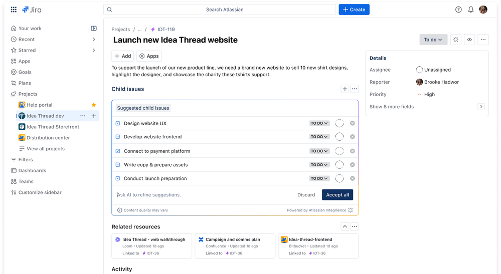 Say goodbye to creating issues one by one and let Atlassian Intelligence do the heavy lifting. Simply choose what issue type you want suggestions for, and AI work breakdown makes suggestions for breaking epics into issues, or issues into sub-tasks. AI work breakdown has started rolling out in beta, and will be available to all users soon.